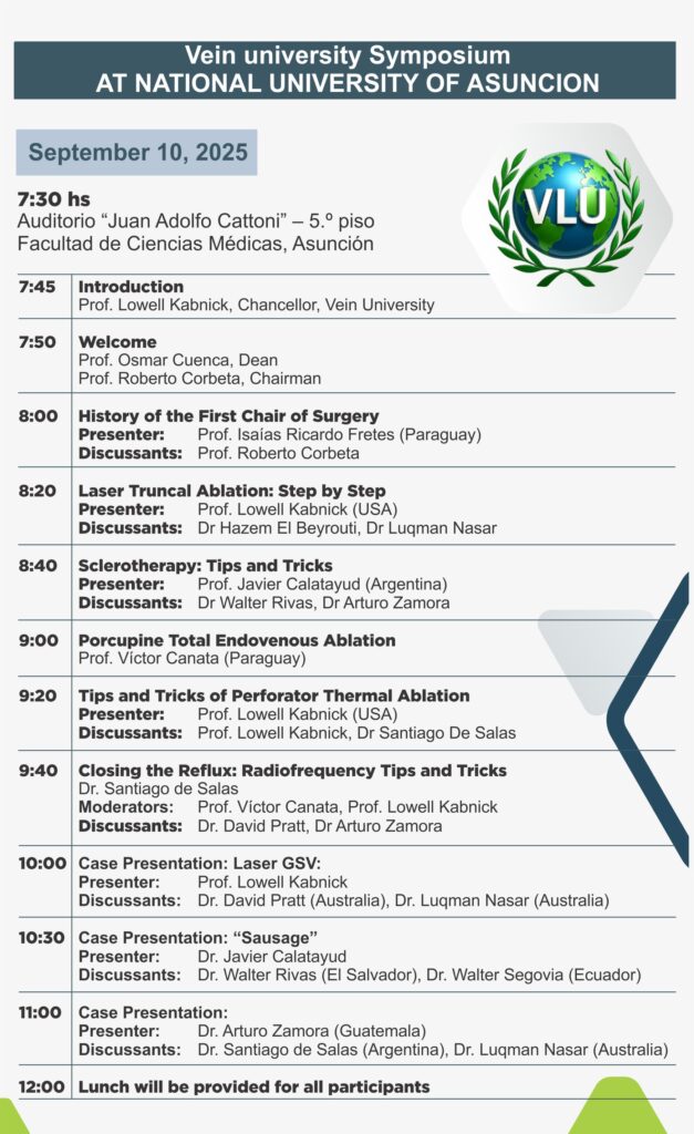 Prof. Dr. Víctor Canata Vein University Training Camp Associate Director 📍 Av. Gral. Bernardino Caballero 729, Asunción 001228 📞 WhatsApp: 595981444692 ✉️ vmcanata@gmail.com 🌎 veinuniversity.org 🌎 ecodopplerparaguay.com.py 🌎 centroparaguayodevarices.com.py 📅 Especialidad: Flebología y Linfología 👨🏫 Profesor Titular Universidad Nacional de Asunción 👨⚕️ Director Médico Centro Paraguayo de Várices